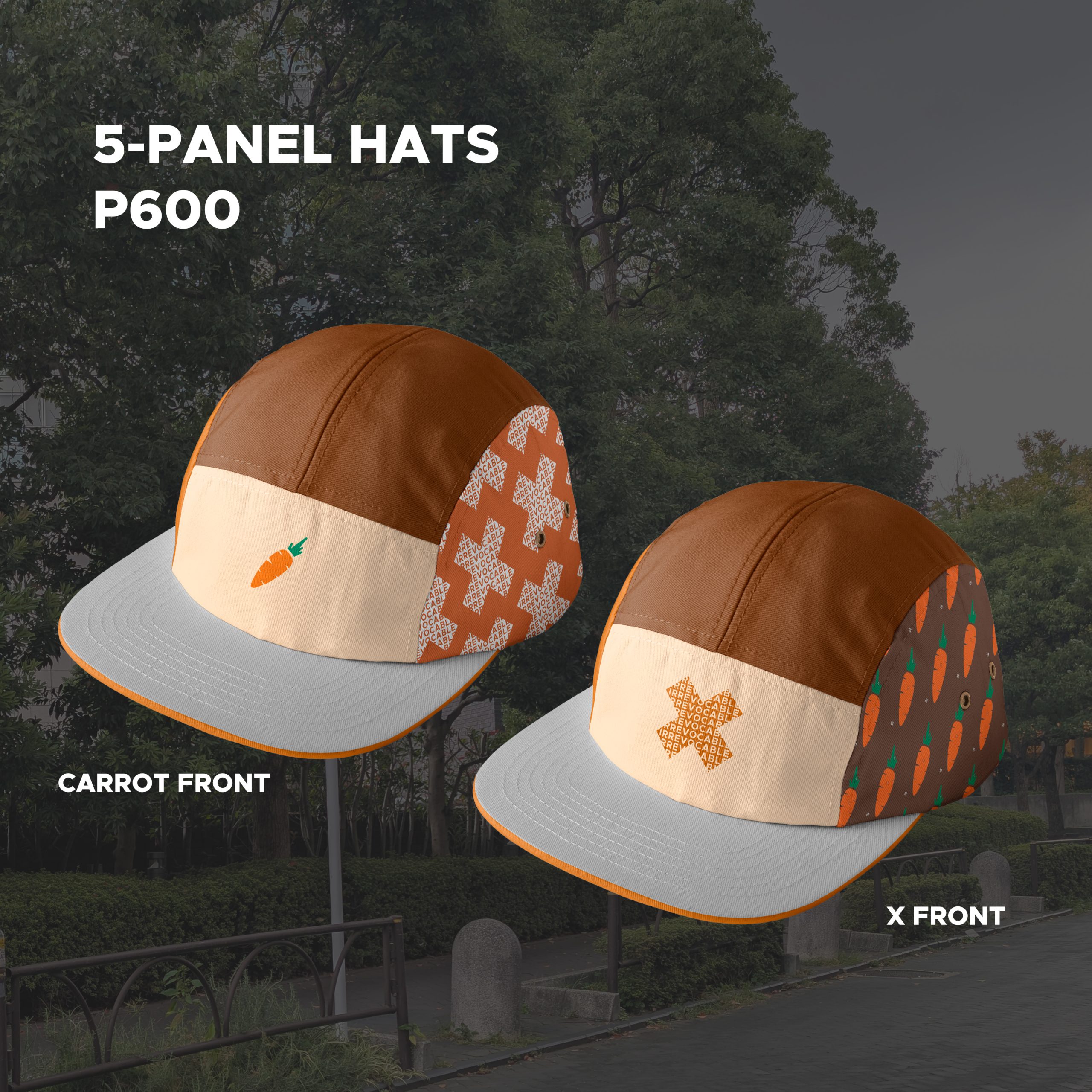 Add a pop of orange to your outfit and be reminded to eat your vegetables with these 5-panel hats.
