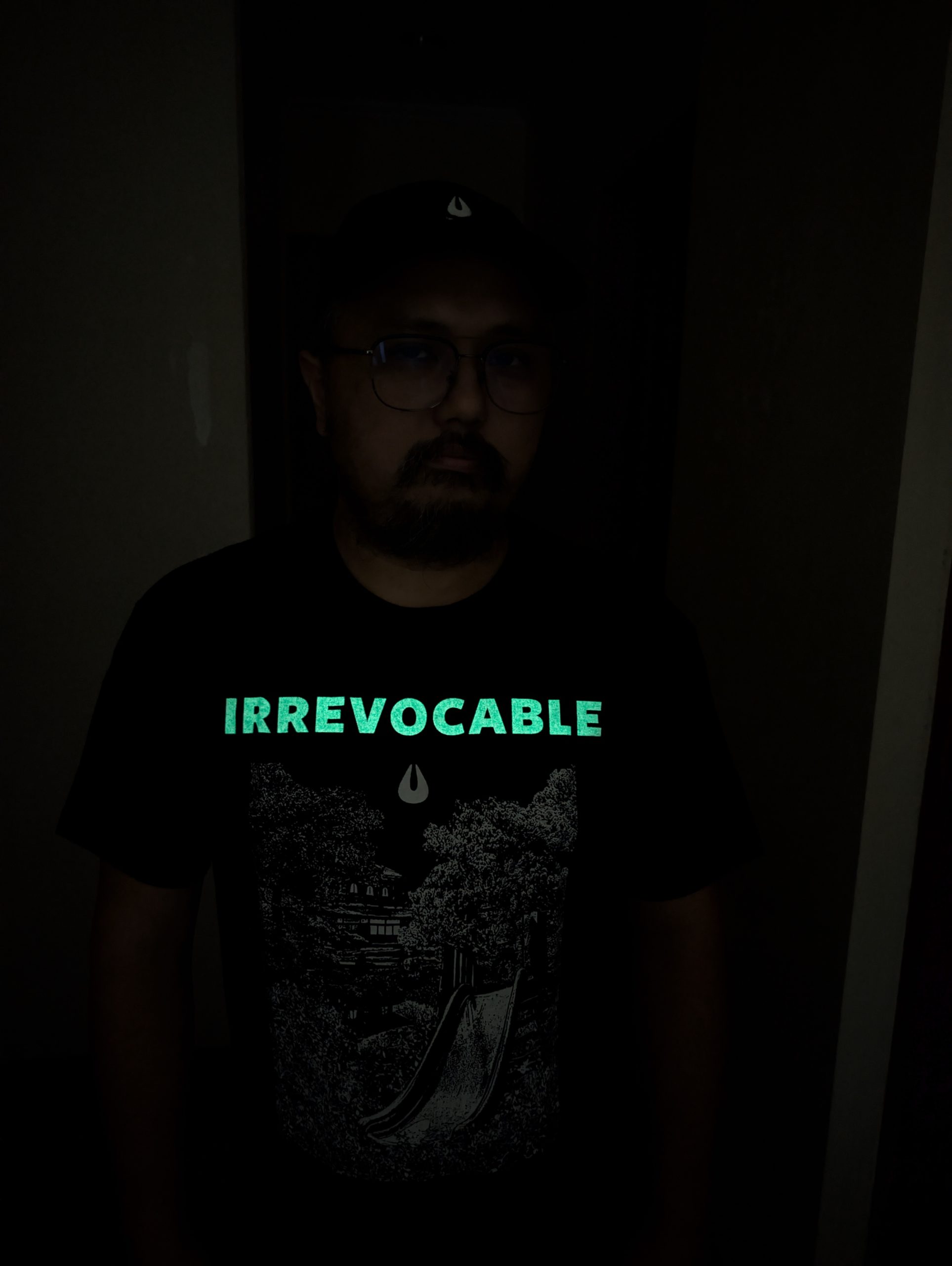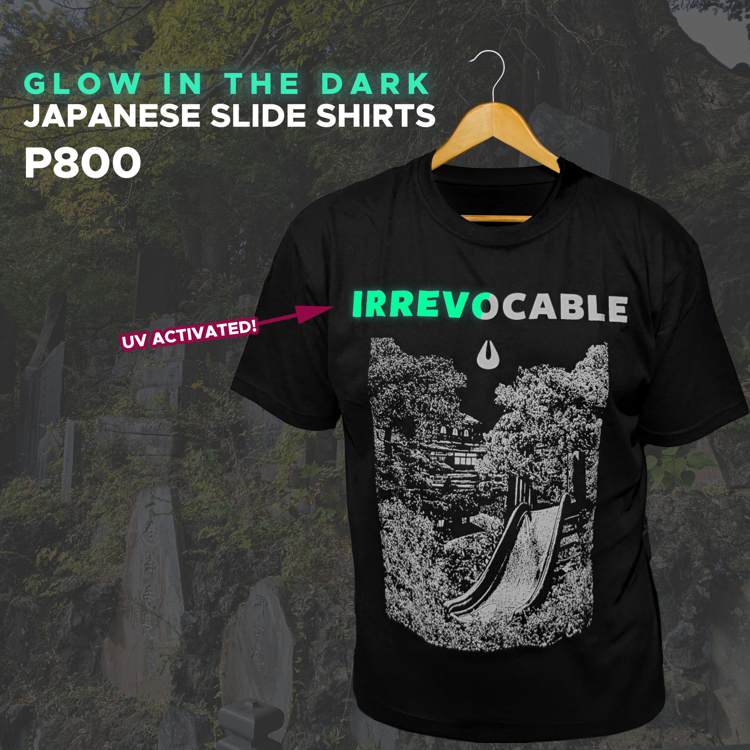 It’s back! Due to popular demand (and Lenian’s obsession with glow-in-the-dark things), here’s a black version of the glow-in-the-dark Japanese slide shirt!