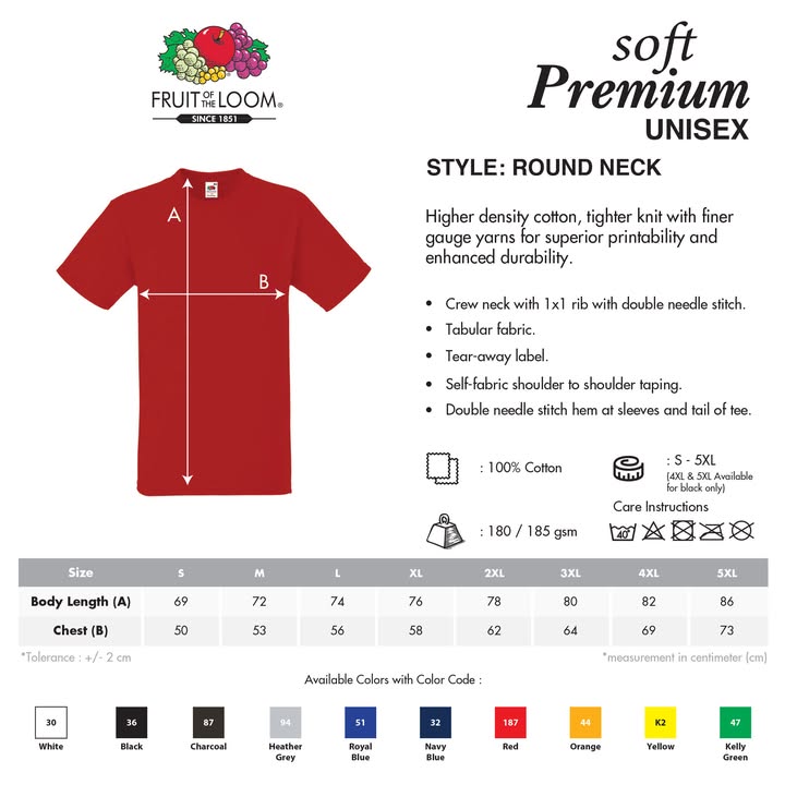 Printed on Fruit of the Loom Soft Premium blanks. Size chart in the product gallery.